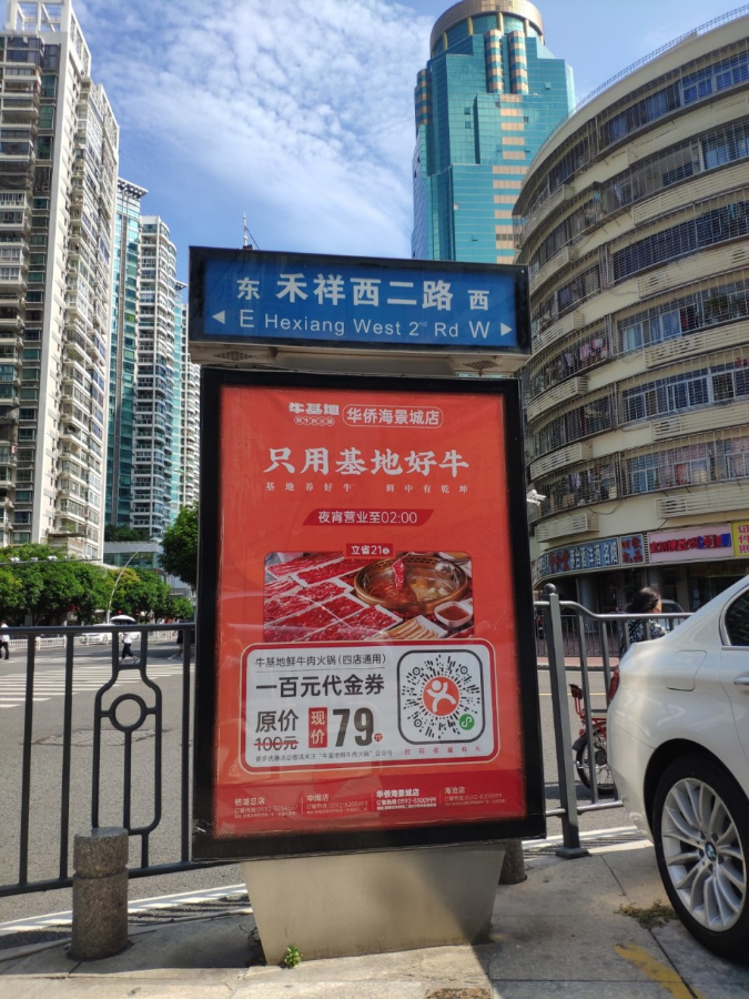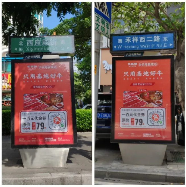 牛基地與天藝傳媒強強聯(lián)手,精準宣傳將?;厝A僑海景城店附近的城市路名牌戶外媒體進行定點宣傳。